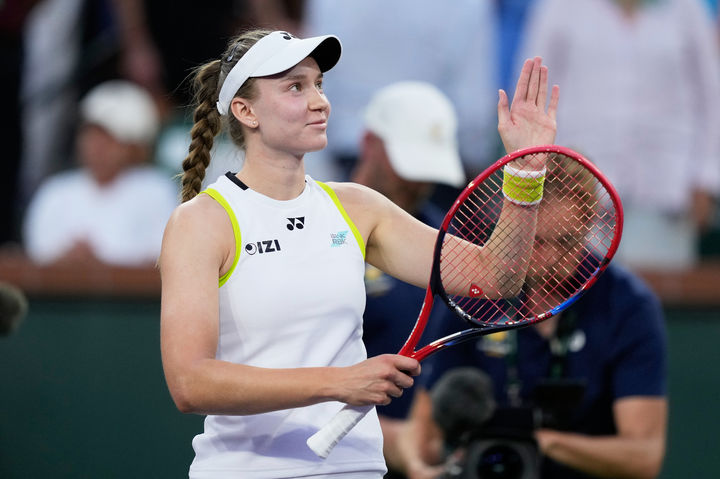 [인디언웰스=AP/뉴시스] 엘레나 리바키나(3위·카자흐스탄)가 12일(현지 시간) 미 캘리포니아주 인디언웰스에서 열린 여자프로테니스(WTA) 투어 BNP 파리바오픈 단식 8강전에서 제시카 페굴라(5위·미국)를 물리친 후 팬들에게 인사하고 있다. 리바키나가 2-0(6-1 7-6)으로 승리하고 4강에 올랐다. 2026.03.13.