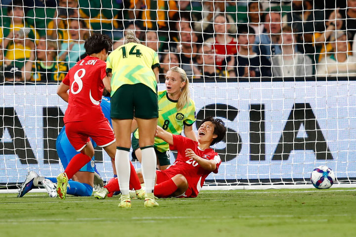 [퍼스=AP/뉴시스] 북한의 채은용(오른쪽)이 13일(현지 시간) 호주 퍼스 렉탱귤러 스타디움에서 열린 2026 아시아축구연맹(AFC) 여자 아시안컵 8강전 호주와 경기 0-2로 끌려가던 후반 20분 만회 골을 넣은 후 기뻐하고 있다. 2026.03.13.