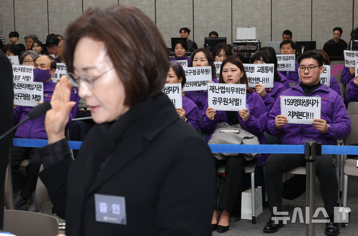 [서울=뉴시스] 권창회 기자 = 이태원 참사 유가족들이 13일 서울 중구 은행회관에서 열린 10·29 이태원참사 진상규명 청문회에서 증인선서 하는 박희영 용산구청장을 바라보고 있다. (공동취재) 2026.03.13. [email protected]