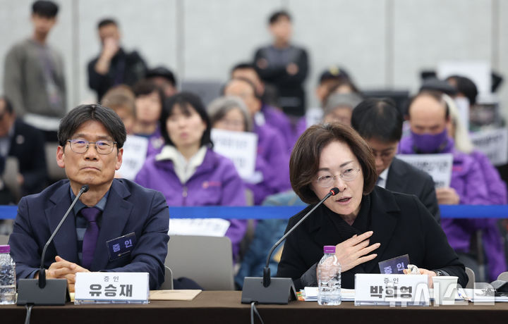 [서울=뉴시스] 권창회 기자 = 박희영 용산구청장이 13일 서울 중구 은행회관에서 열린 10·29 이태원참사 진상규명 청문회에서 위원 질의에 답하고 있다. 2026.03.13. [email protected]