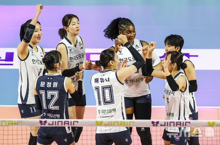 [인천=뉴시스] 정병혁 기자 = 13일 인천 부평구 인천삼산월드체육관에서 열린 2025-2026 프로배구 V리그 여자부 흥국생명과 한국도로공사의 경기, 한국도로공사 선수들이 화이팅을 외치고 있다. 2026.03.13. [email protected]