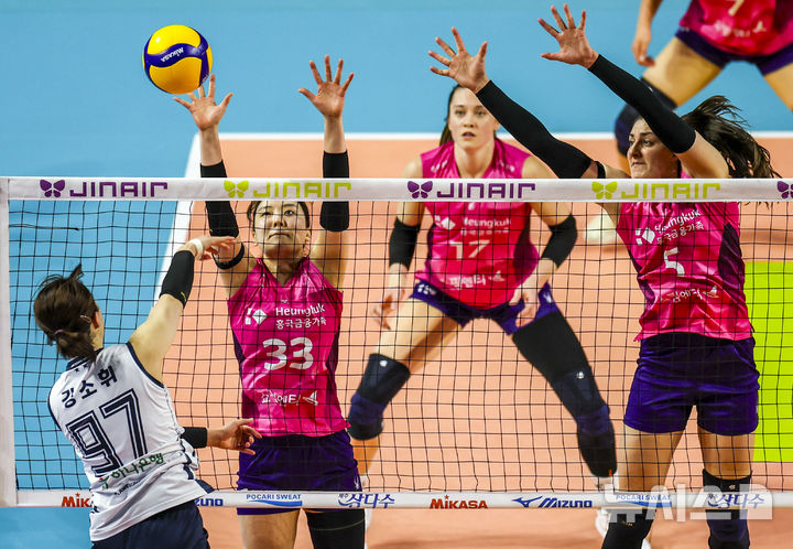 [인천=뉴시스] 정병혁 기자 = 13일 인천 부평구 인천삼산월드체육관에서 열린 2025-2026 프로배구 V리그 여자부 흥국생명과 한국도로공사의 경기, 흥국생명 이나연, 피치가 한국도로공사 강소휘의 공격을 막고 있다. 2026.03.13. [email protected]