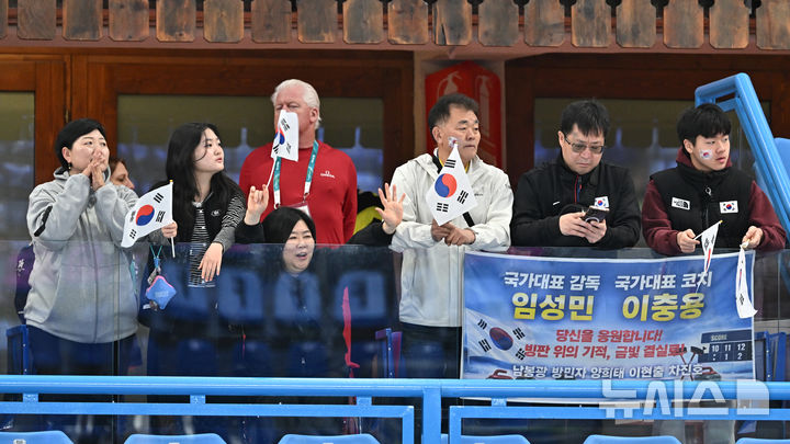[코르티나담페초=뉴시스] 사진공동취재단 = 13일(현지시간) 이탈리아 코르티나담페초 컬링 올림픽 스타디움에서 열린 2026 밀라노 코르티나 패럴림픽 휠체어컬링 혼성 4인조 한국과 캐나다와의 준결승전에서 관중들이 임성민 감독과 이충용 코치를 응원하고 있다. 2026.03.13. [email protected]