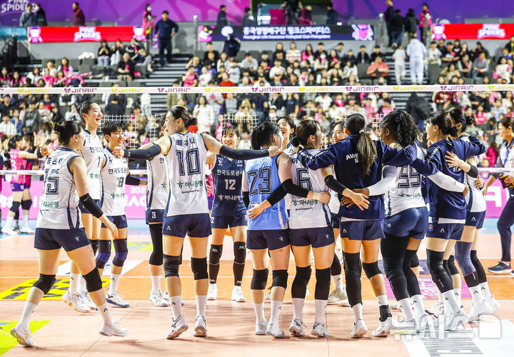 [인천=뉴시스] 정병혁 기자 = 13일 인천 부평구 인천삼산월드체육관에서 열린 2025-2026 프로배구 V리그 여자부 흥국생명과 한국도로공사의 경기에서 승리해 정규리그 1위를 확정한 한국도로공사 선수들이 기뻐하고 있다. 2026.03.13. [email protected]
