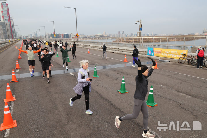 [서울=뉴시스] 황준선 기자 = 14일 오전 서울 마포대교 일대에서 도심 도로를 시민에게 개방하는 생활체육 프로그램 '쉬엄쉬엄 모닝' 행사 참가자들이 마포대교를 뛰고 있다. 2026.03.14. [email protected]