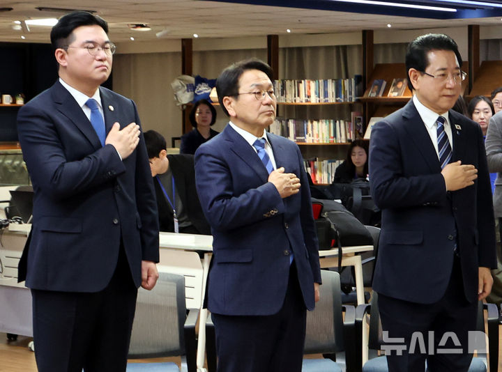 [서울=뉴시스] 박주성 기자 = 더불어민주당 전남광주통합특별시장 경선 후보인 김영록(오른쪽부터), 강기정, 정준호 예비후보가 14일 오후 서울 여의도 더불어민주당사에서 열린 제9회 전국동시지방선거 전남광주통합특별시장 후보자 검증을 위한 온라인 합동연설회에 참석해 국민의례를 하고 있다. 2026.03.14. [email protected]