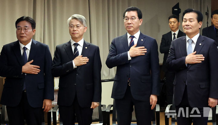 [서울=뉴시스] 박주성 기자 = 더불어민주당 전남광주통합특별시장 경선 후보인 주철현(오른쪽부터), 신정훈, 민형배, 이병훈 예비후보가 14일 오후 서울 여의도 더불어민주당사에서 열린 제9회 전국동시지방선거 전남광주통합특별시장 후보자 검증을 위한 온라인 합동연설회에 참석해 국민의례를 하고 있다. 2026.03.14. [email protected]