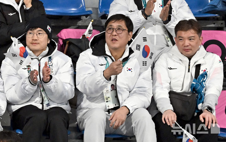 [코르티나담페초=뉴시스] 사진공동취재단 = 최휘영 문화체육관광부장관(가운데)이 13일(현지시간) 이탈리아 코르티나담페초 컬링 올림픽 스타디움에서 열린 2026 밀라노 코르티나 패럴림픽 휠체어컬링 혼성 4인조 스웨덴과의 동메달 결정전에서 관계자들과 함께 응원을 하고 있다. 2026.03.14. [email protected]
