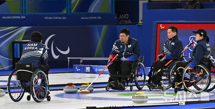 [코르티나담페초=뉴시스] 사진공동취재단 = 휠체어컬링 한국대표팀 선수들이 13일(현지시간) 이탈리아 코르티나담페초 컬링 올림픽 스타디움에서 열린 2026 밀라노 코르티나 패럴림픽 휠체어컬링 혼성 4인조 스웨덴과의 동메달 결정전에서 작전타임에 대화를 하고 있다. 2026.03.14. [email protected]
