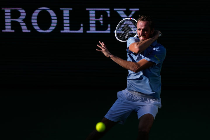 [인디언웰스=AP/뉴시스] 다닐 메드베데프(11위·러시아)가 14일(현지 시간) 미 캘리포니아주 인디언웰스에서 열린 남자프로테니스(ATP) 투어 BNP 파리바오픈 단식 준결승에서 카를로스 알카라스(1위·스페인)와 경기하고 있다. 메드베데프가 2-0(6-3 7-6)으로 승리하고 결승에 올라 얀니크 신네르(2위·이탈리아)와 우승을 다툰다. 2026.03.15.