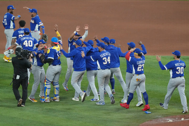 [마이애미=AP/뉴시스] 베네수엘라 선수들이 14일(현지 시간) 미 플로리다주 마이애미 론디포 파크에서 열린 2026 월드베이스볼클래식(WBC) 8강전에서 일본을 8-5로 꺾고 4강에 진출한 후 자축하고 있다. 2026.03.15.
