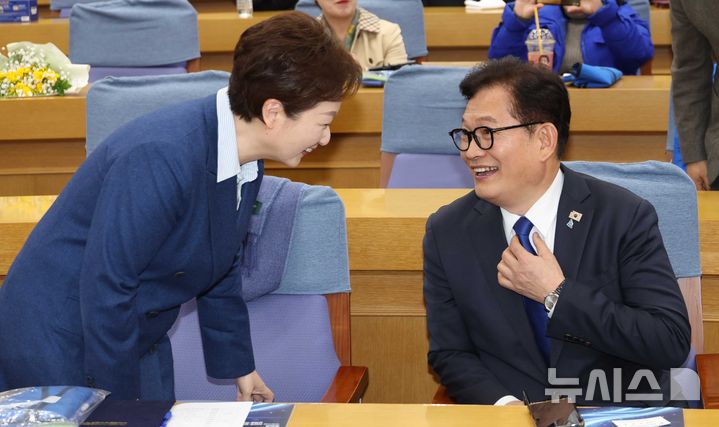 [서울=뉴시스] 조성봉 기자 = 이언주 더불어민주당 의원과 송영길(오른쪽) 전 대표가 15일 오후 서울 여의도 국회 의원회관 소회의실에서 열린 '뉴이재명을 논하다' 토론회에서 대화를 하고 있다. 2026.03.15. [email protected]