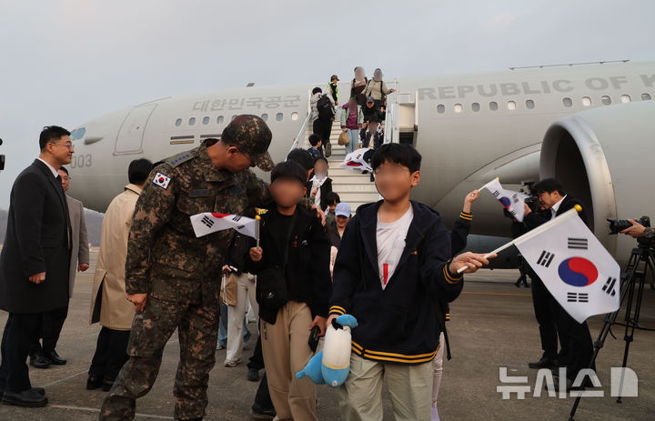 [성남=뉴시스] 사진공동취재단 = 중동 전쟁 확대로 레바논에 체류 중이던 우리 국민 204명과 외국 국적 가족 5명 및 우방국(일본) 국민 2명 등 총 211명이 15일 오후 경기 성남시 서울공항에서 대한민국 군 수송기(KC-330)를 타고 도착하고 있다. 2026.03.15. [email protected]