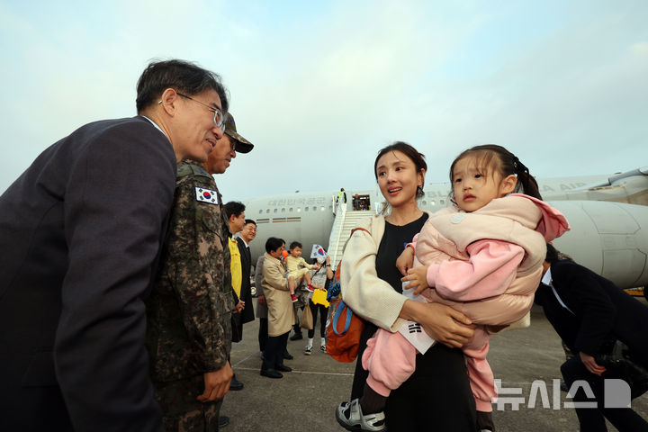 [성남=뉴시스] 사진공동취재단 = 중동 전쟁 확대로 레바논에 체류 중이던 우리 국민 204명과 외국 국적 가족 5명 및 우방국(일본) 국민 2명 등 총 211명이 15일 오후 경기 성남시 서울공항에서 대한민국 군 수송기(KC-330)를 타고 도착하고 있다. 2026.03.15. [email protected]