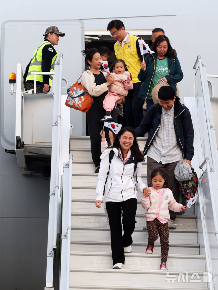 [성남=뉴시스] 사진공동취재단 = 15일 오후 경기 성남 서울공항에서 중동 상황 악화로 공군 다목적 수송기 KC-330 '시그너스'를 타고 귀국한 현지 체류 교민들이 발걸음을 옮기고 있다.