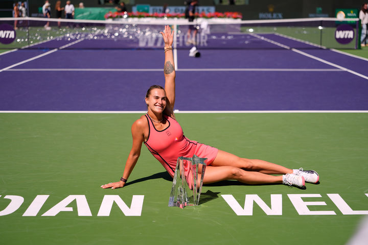 [인디언웰스=AP/뉴시스] 아리나 사발레카(1위·벨라루스)가 15일(현지 시간) 미 캘리포니아주 인디언웰스에서 열린 여자프로테니스(WTA) 투어 BNP 파리바오픈 단식 정상에 올라 트로피를 들고 포즈를 취하고 있다. 사발렌카는 결승에서 엘레나 리바키나(3위·카자흐스탄)에게 2-1(3-6 6-3 7-6) 역전승을 거두고 우승하며 호주오픈 결승 패배를 설욕했다. 2026.03.16.