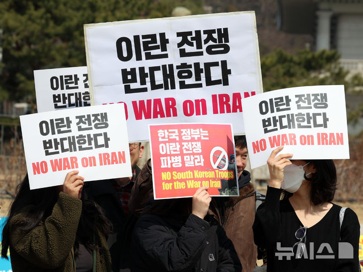 [서울=뉴시스] 이영환 기자 = 노동자 연대 등 시민사회단체 회원들이 16일 오후 서울 종로구 청와대 분수대 앞에서 열린 긴급 기자회견 '한국 정부는 이란 전쟁 파병 생각도 말라! 미국과 이스라엘의 이란 전쟁 반대한다!'에서 구호를 외치고 있다. 2026.03.16. [email protected]