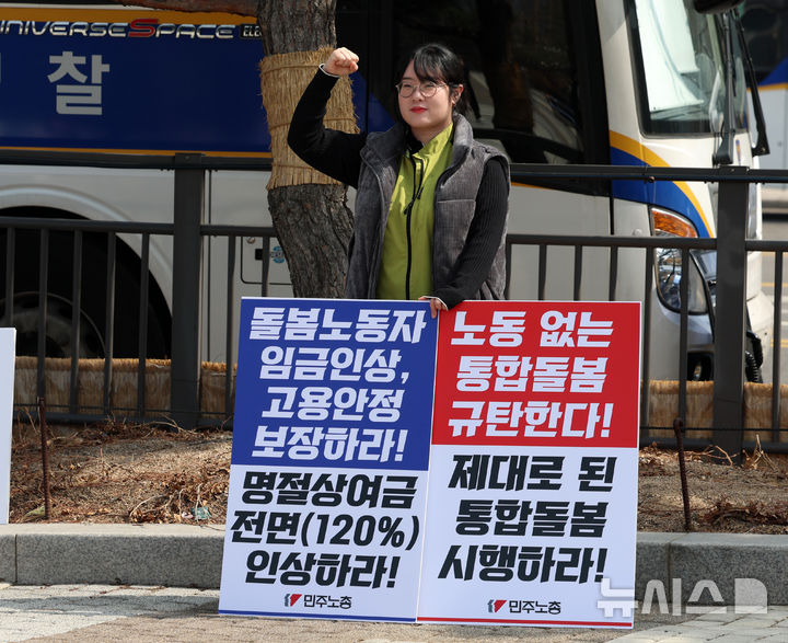 [서울=뉴시스] 이영환 기자 = 민주노총 보건의료노조 조합원이 16일 서울 종로구 청와대 분수대 앞에서 돌봄노동자 릴레이 선전전을 하고 있다. 2026.03.16. [email protected]