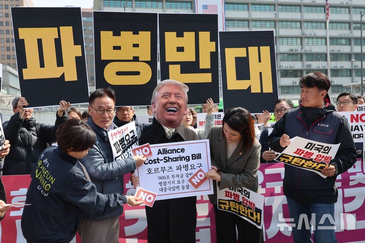 [서울=뉴시스] 권창회 기자 = 양경수 민주노총 위원장을 비롯한 조합원들이 16일 서울 종로구 주한미국대사관 인근에서 열린 미국 호르무즈 해협 파병 요구 규탄 및 파병 반대 긴급 기자회견에서 호르무즈 파병 요구 규탄 퍼포먼스를 하고 있다. 2026.03.16. [email protected]