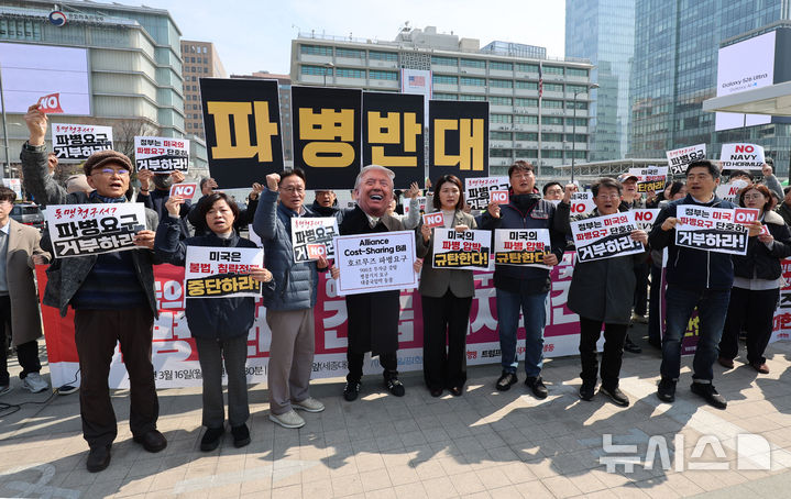 [서울=뉴시스] 권창회 기자 = 양경수 민주노총 위원장을 비롯한 조합원들이 16일 서울 종로구 주한미국대사관 인근에서 열린 미국 호르무즈 해협 파병 요구 규탄 및 파병 반대 긴급 기자회견에서 호르무즈 파병 요구 규탄 퍼포먼스를 한 뒤 구호를 외치고 있다. 2026.03.16. [email protected]