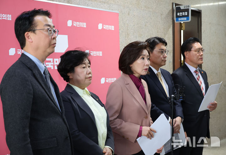 [서울=뉴시스] 김금보 기자 = 나경원 국민의힘 의원 등 국회 법제사법위원회 위원들이 16일 오후 서울 여의도 국회에서 긴급기자회견을 열고 법사위 현안 관련 발언을 하고 있다. 2026.03.16. [email protected]