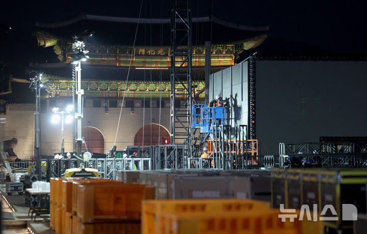 [서울=뉴시스] 김진아 기자 = 방탄소년단(BTS)의 서울 광화문광장 컴백 공연을 닷새 앞둔 16일 서울 종로구 광화문광장에서 무대 설치 작업이 진행되고 있다. 2026.03.16. [email protected]