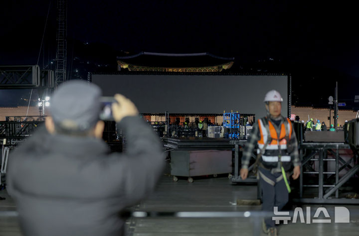 [서울=뉴시스] 김진아 기자 = 방탄소년단(BTS)의 서울 광화문광장 컴백 공연을 닷새 앞둔 16일 서울 종로구 광화문광장에서 무대 설치 작업이 진행되고 있다. 2026.03.16. [email protected]