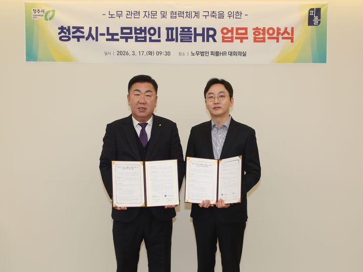 [청주=뉴시스] 이범석(왼쪽) 청주시장과 이지환 노무법인 피플HR대표가 17일 상당구 주중동 노무법인 피플HR 사무실에서 노동법 자문 및 협력체계 구축을 위한 업무협약을 하고 있다. (사진=청주시 제공) 2026.03.17. [email protected]