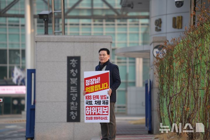 [청주=뉴시스] 6.3지방선거 충북 옥천군수에 도전하는 전상인 국회의원(박덕흠) 보좌관이 17일 오전 충북경찰청 정문 앞에서 1인 시위를 벌이고 있다. 전 보좌관은 "충북의 한 방송사가 보도한 '출판기념회 참석자 국밥·차량 제공 의혹' 사안은 허위제보에 기인한 가짜 뉴스"라며 엄정하고 신속하게 수사해달라고 경찰에 요구했다. (사진=전상인 보좌관 제공) 2026.03.17. [email protected]