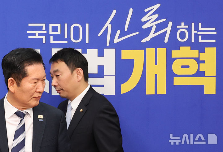 [서울=뉴시스] 김금보 기자 = 정청래 더불어민주당 대표와 김용민 국회 법제사법위원회 여당 간사가 17일 오전 서울 여의도 국회에서 검찰개혁 관련 긴급 기자회견에 참석하고 있다. 2026.03.17. [email protected]