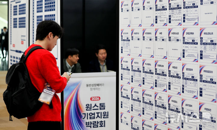 [대구=뉴시스] 이무열 기자 = 17일 대구 북구 엑스코에서 열린 2026 원스톱기업지원박람회에서 구직자가 참여기업 구인정보를 살펴보고 있다. 2026.03.17. [email protected]