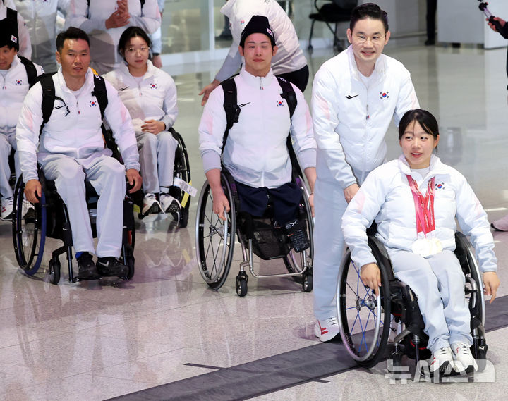 [인천공항=뉴시스] 권창회 기자 = 한국 여성 최초 동계패럴림픽 금메달을 포함해 5개의 메달을 목에 걸며 단일 대회 최다 메달 신기록을 세운 김윤지와 선수단이 17일 인천국제공항 제2여객터미널을 통해 귀국하고 있다. 2026.03.17. [email protected]