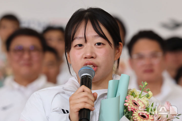 [인천공항=뉴시스] 권창회 기자 = 한국 여성 최초 동계패럴림픽 금메달을 포함해 5개의 메달을 목에 걸며 단일 대회 최다 메달 신기록을 세운 김윤지가 17일 인천국제공항 제2여객터미널에서 열린 2026 밀라노-코르티나 동계 패럴림픽 해단식에서 대회 MVP에 선정된 뒤 발언하고 있다. 2026.03.17. [email protected]