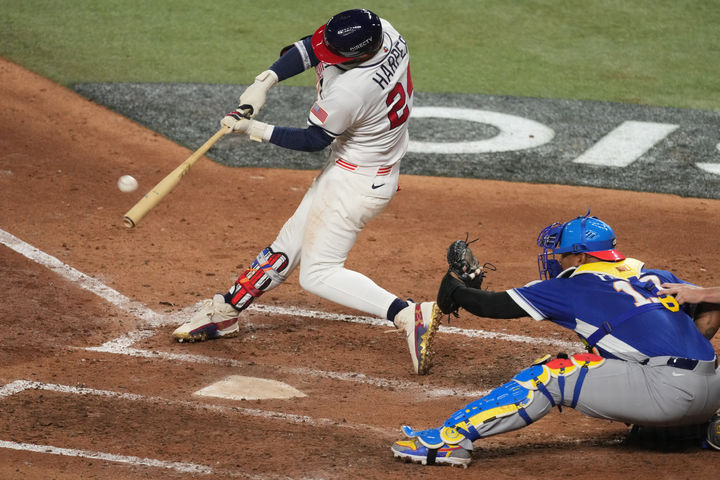 [마이애미=AP/뉴시스] 미국의 브라이스 하퍼가 17일(현지 시간) 미 플로리다주 마이애미 론디포 파크에서 열린 2026 월드베이스볼클래식(WBC) 결승전 베네수엘라와 경기 0-2로 뒤지고 있던 8회 말 동점 2점 홈런을 치고 있다. 2026.03.18.