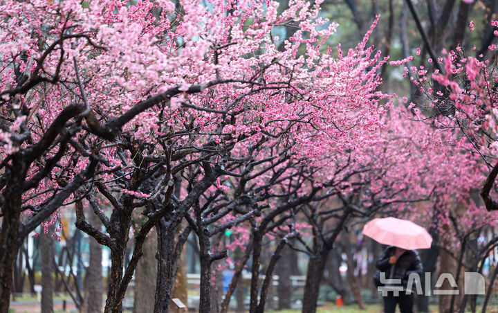[대구=뉴시스] 이무열 기자 = 봄비가 내리는 18일 대구 중구 국채보상운동기념공원에 만개한 홍매화 아래로 우산을 쓴 한 시민이 산책하고 있다. 2026.03.18. [email protected]