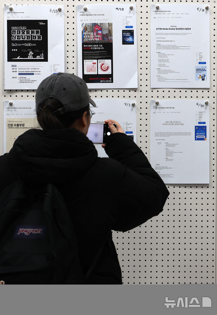 [서울=뉴시스] 이영환 기자 = 한 학생이 18일 서울 성북구의 한 대학교 일자리플러스센터 일자리정보 게시판에서 채용공고를 살펴보고 있다.