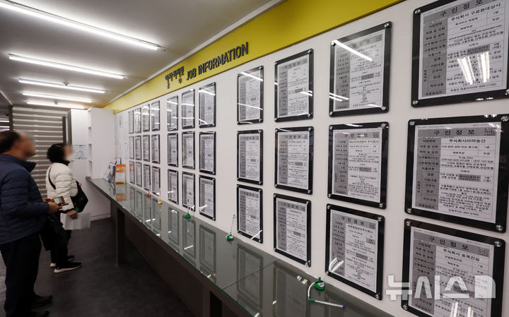 [서울=뉴시스] 이영환 기자 = 구직자들이 18일 서울 마포구 서부고용복지플러스센터에서 일자리정보 게시판을 살펴보고 있다.