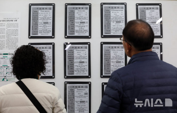 [서울=뉴시스] 이영환 기자 = 구직자들이 18일 서울 마포구 서부고용복지플러스센터에서 일자리정보 게시판을 살펴보고 있다.