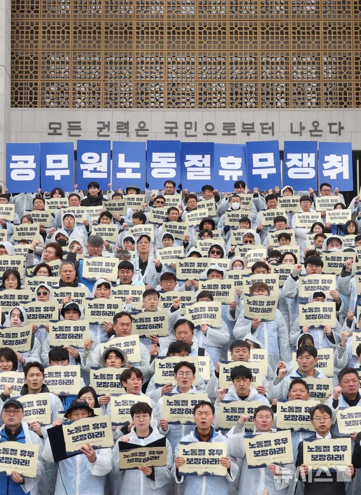 [서울=뉴시스] 조성봉 기자 = 18일 오후 서울 여의도 국회 본청 계단에서 열린 공무원 5.1 노동절 휴무 쟁취 기자회견에서 전국공무원노동조합, 대한민국공무원노동조합총연맹 등 참가자들이 구호를 외치고 있다. 2026.03.18. [email protected]