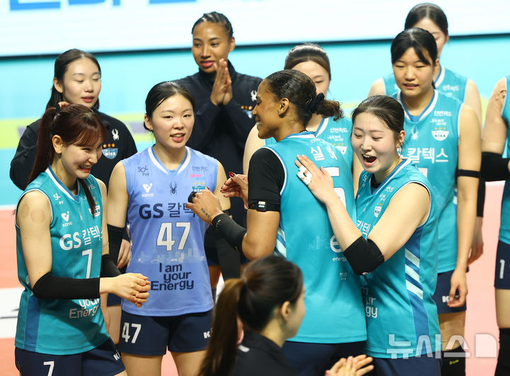 [서울=뉴시스] 황준선 기자 = 18일 서울 중구 장충체육관에서 열린 2025-2026 V-리그 여자부 현대건설 힐스테이트 배구단과 GS칼텍스 서울KIXX의 경기, 세트스코어 3-0으로 승리하며 준플레이오프 진출을 확정지은 GS칼텍스 선수들이 자축하고 있다. 2026.03.18. [email protected]