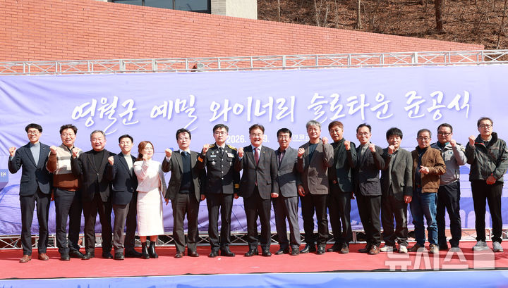 [영월=뉴시스]홍춘봉 기자 = 19일 강원 영월군 김삿갓면 예밀리 와이너리 슬로타운 앞 광장에서 최명서 영월군수와 기관단체장, 지역주민 등이 참석한 가운데 '예밀 와이너리 슬로타운' 준공식을 개최하고 있다.(사진=영월군 제공)[email protected]