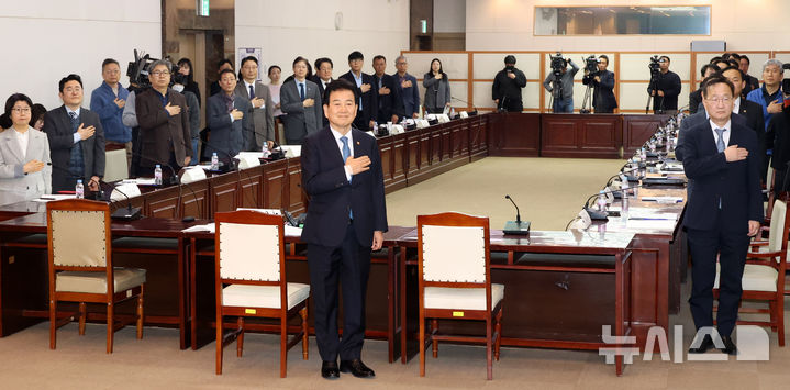 [서울=뉴시스] 추상철 기자 = 정동영 통일부 장관이 19일 오전 서울 종로구 정부서울청사에서 열린 '2026년 제1차 남북관계발전위원회'에서 국민의례를 하고 있다. 2026.03.19. [email protected]