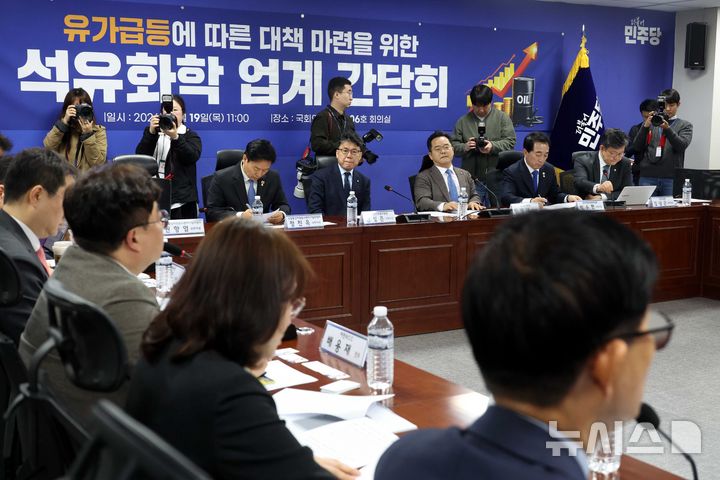 [서울=뉴시스] 조성봉 기자 = 민병덕 더불어민주당 을지로위원장과 진성준 국회 예산결산특별위원장 등이 19일 오전 서울 여의도 국회에서 열린 유가 급등에 따른 대책 마련을 위한 석유화학 대기업 공개간담회에서 업계 관계자들의 발언을 경청하고 있다. 2026.03.19. [email protected]