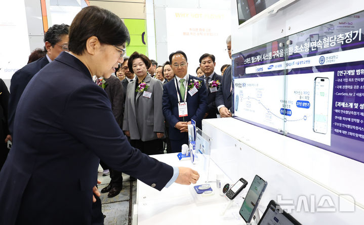 [서울=뉴시스] 최진석 기자 = 정은경 보건복지부 장관이 19일 서울 강남구 코엑스에서 열린 제41회 국제의료기기병원설비전시회(KIMES)에서 초소형 연속혈당측정기를 살펴보고 있다. 2026.03.19. [email protected]