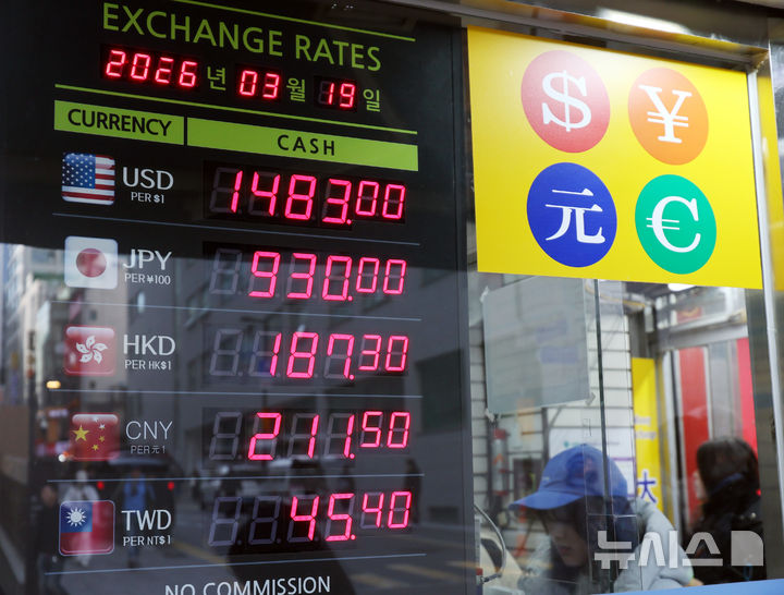 [서울=뉴시스] 박주성 기자 = 이란 최대 가스전 피격에 국제 유가가 급등하면서 원·달러 환율이 1500원을 돌파한 19일 오후 서울 중구 명동 한 환전소에 환전 시세가 보이고 있다. .2026.03.19. [email protected]