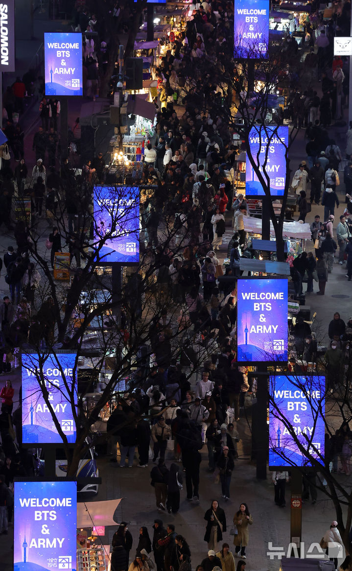 [서울=뉴시스] 홍효식 기자 = 방탄소년단(BTS)의 컴백 공연을 이틀 앞둔 19일 오후 서울 중구 명동 거리에서 BTS와 팬클럽 아미를 환영하는 메시지 영상이 미디어 폴을 통해 송출되고 있다. 2026.03.19. [email protected]
