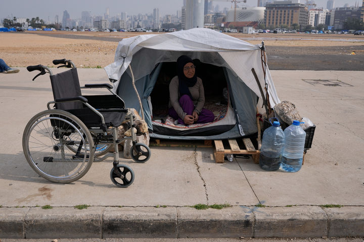 [베이루트=AP/뉴시스] 19일(현지 시간) 이스라엘의 공습을 피해 레바논 남부에서 피란 온 한 장애 여성이 베이루트 공터에 설치한 작은 텐트 안에 앉아 있다. 2026.03.20.