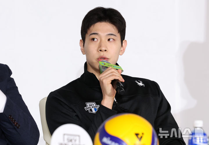 [서울=뉴시스] 이영환 기자 = 현대캐피탈 황승빈이 20일 오후 서울 강남구 호텔 청담 리베라 베르사이유홀에서 열린 진에어 2025~2026 V리그 포스트시즌 미디어데이에 참석해 각오를 전하고 있다. 2026.03.20. [email protected]