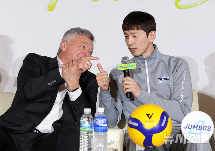 [서울=뉴시스] 이영환 기자 = 대한항공 헤난 달 조토 감독과 한선수가 20일 오후 서울 강남구 호텔 청담 리베라 베르사이유홀에서 열린 진에어 2025~2026 V리그 포스트시즌 미디어데이에 참석해 각오를 전하고 있다. 2026.03.20. [email protected]