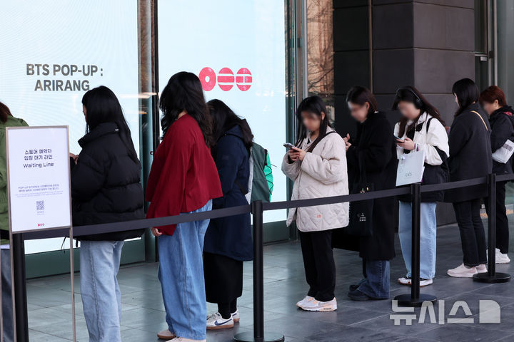 [서울=뉴시스] 조성우 기자 = 방탄소년단(BTS) 컴백 공연을 하루 앞둔 20일 서울 용산구 하이브 사옥 앞에서 팬들이 팝업스토어 '아리랑'에 입장하기 위해 줄을 서 있다. 2026.03.20. [email protected]